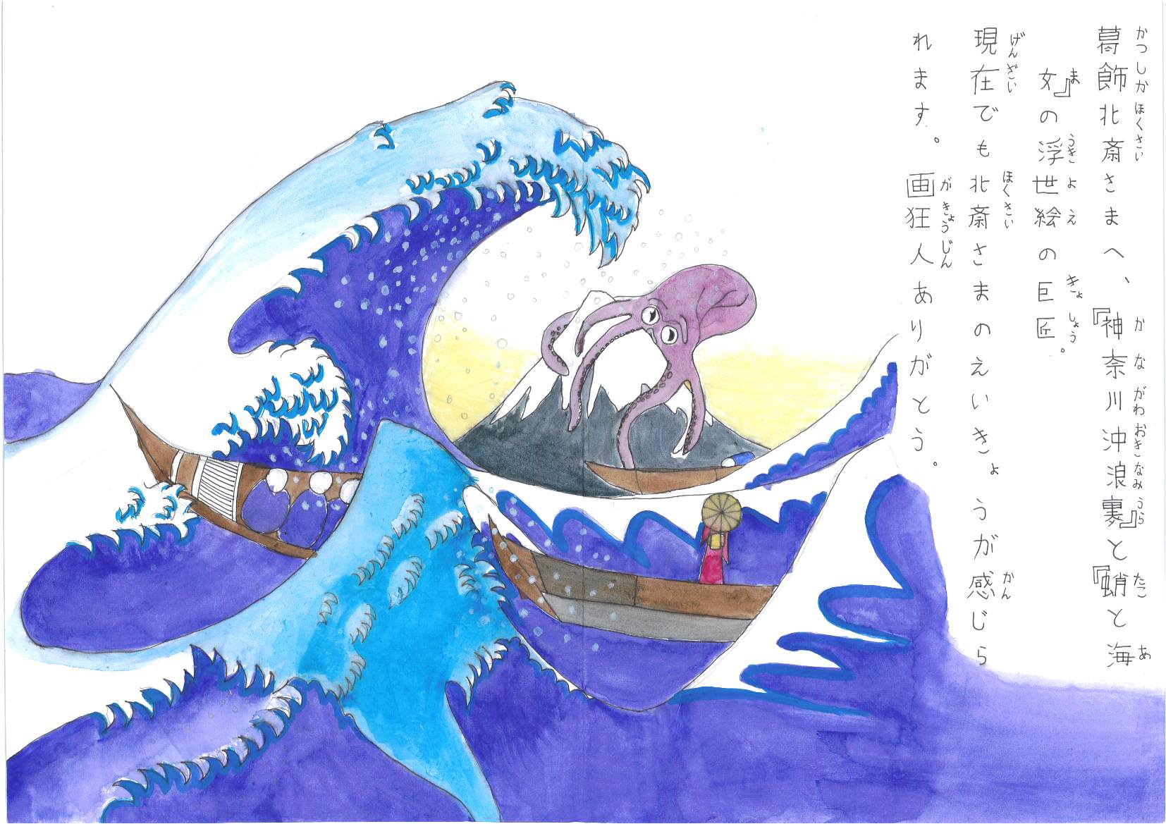 J’ai fait une œuvre s’inspirant beaucoup de la grande vague d’Hokusai, afin de faire hommage à ce grand peintre. J’ai mélangé deux œuvres, en réalité : La grande vague de Kanagawa ainsi que le rêve de la femme du pêcheur. C’est une aquarelle. On y voit un poulpe sur le mont Fuji en arrière plan, des bateaux avec des pêcheurs, ainsi qu’une femme en kimono face à la montagne. Au premier plan, on retrouve la grande vague.