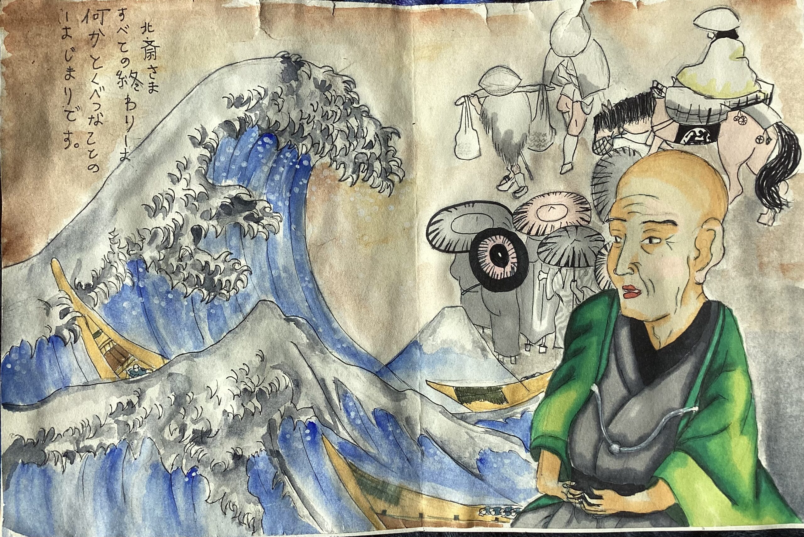 J’ai honoré Katsushika Hokusai sur mon étégami. Hokusai fut un peintre, dessinateur, graveur et auteur japonais célèbre dans le monde entier. Il a inspiré de nombreux artistes européens et je l’aime beaucoup pour ses nombreux styles de dessins ainsi que pour sa vision de voir le monde. Sur mon étégami j’ai représenté sa célèbre vague, ainsi que son autoportrait en premier plan. En second plan j’ai dessiné un extrais d’une page de ses Mangas représentant des gens avec des chapeaux et des ombrelles cachant leur visages.