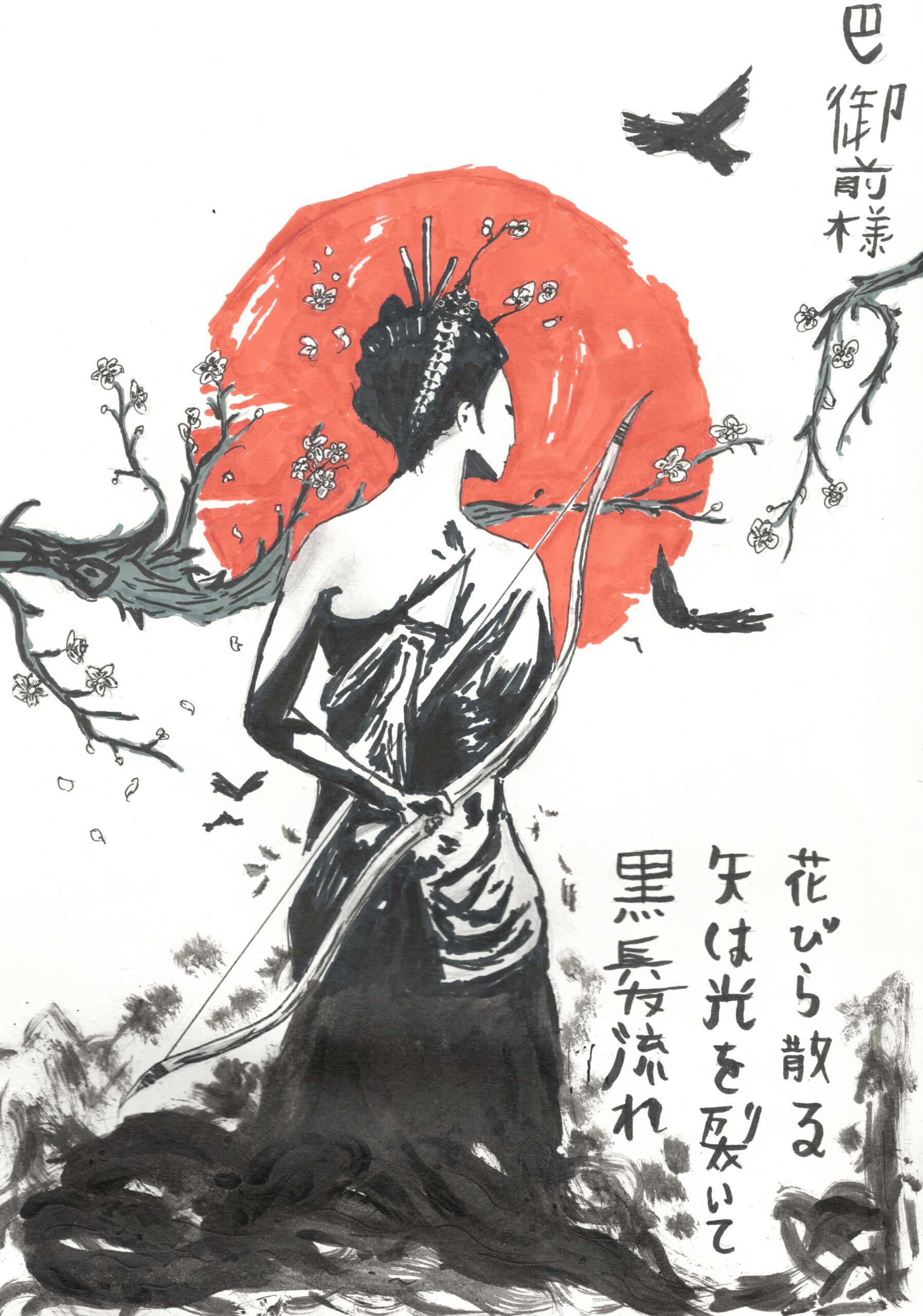 Je fais un etegami sur Tomoe Gozen, une samourai japonaise, pour la remercier de s’être battue pour son pays et le