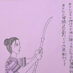 Cette illustration encre et aquarelle représente Tomoe Gozen, légendaire femme samouraï du Japon féodal du XIIe siècle,