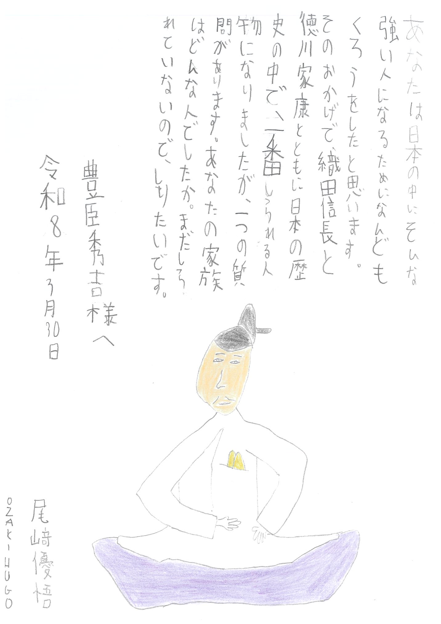 Cet etegami est adressé à Toyotomi Hideyoshi, souvent considérée comme la troisième personne la plus importante de l’époque Sengoku. J’ai choisi ce personnage car il m’intéresse, surtout en regardant le 大河ドラマ de cette année, qui parle de sa vie et celui de son frère. Je lui pose ici une question sur ses origines, car cela n’est pas connu, et donc qu’il serait intéressant de connaître ses origines exactes. Le dessin représente Toyotomi Hideyoshi, portant dans une poche les “sandales” de Oda Nobunaga pour les chauffer, épisode réel très connu de sa vie où il a été récompensé par Oda Nobunaga.