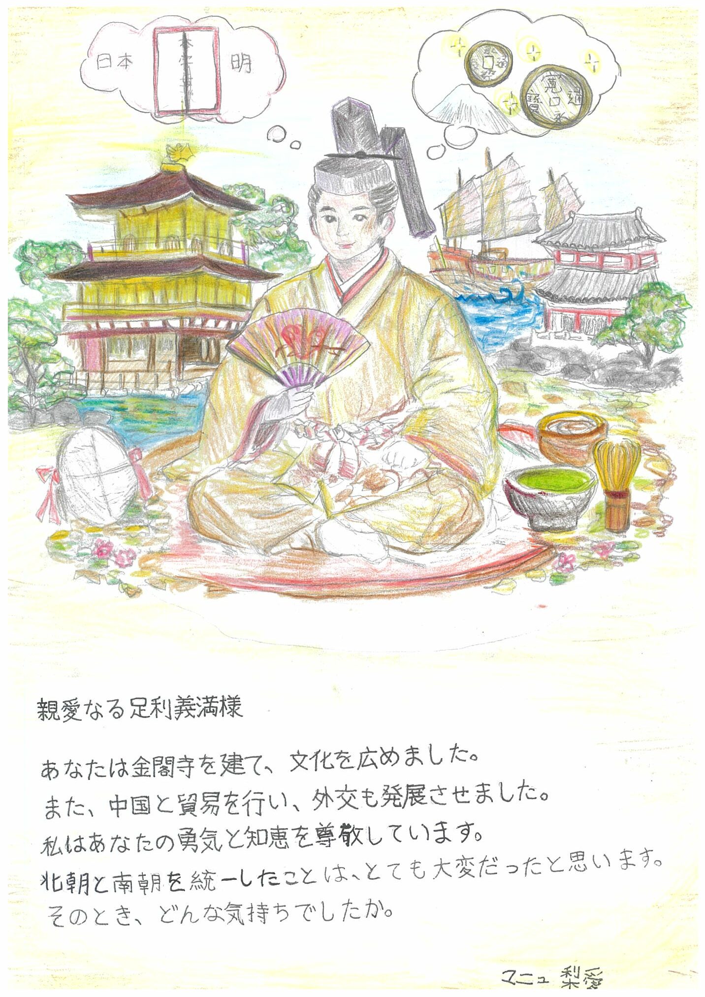 Cette œuvre est un etegami de la part de moi représentant Ashikaga Yoshimitsu au centre, avec des éléments importants de son époque.