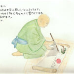 Le destinataire de mon etegami est le célèbre peintre Hokusai. Je me suis inspirée d’une de ses estampes qui repré