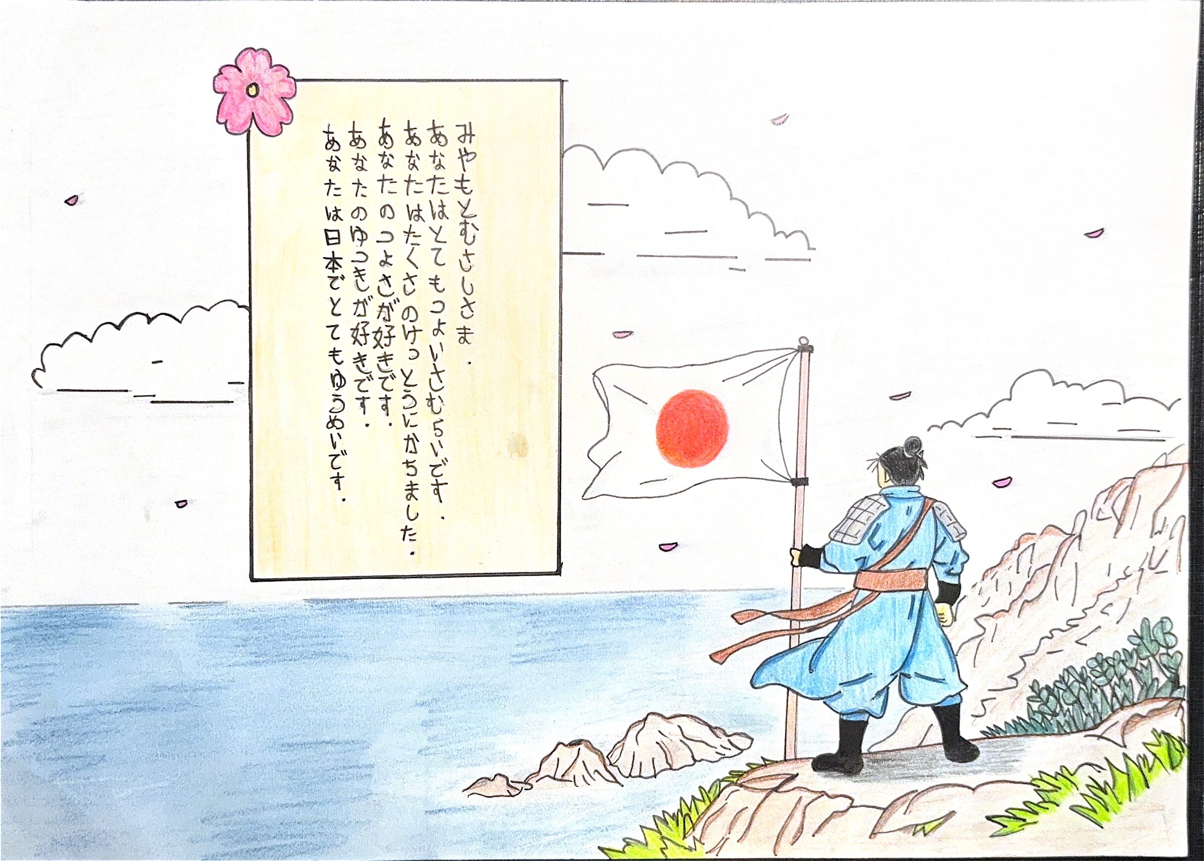 Mon etegami illustre le courage et la persévérance, comme dans les écrits de Miyamoto Musashi. Le dessin représente un samouraï solitaire, debout sur les falaises, brandissant le drapeau du Japon face à l’océan. Chaque détail exprime la détermination et l’harmonie entre l’homme, la nature et l’histoire.