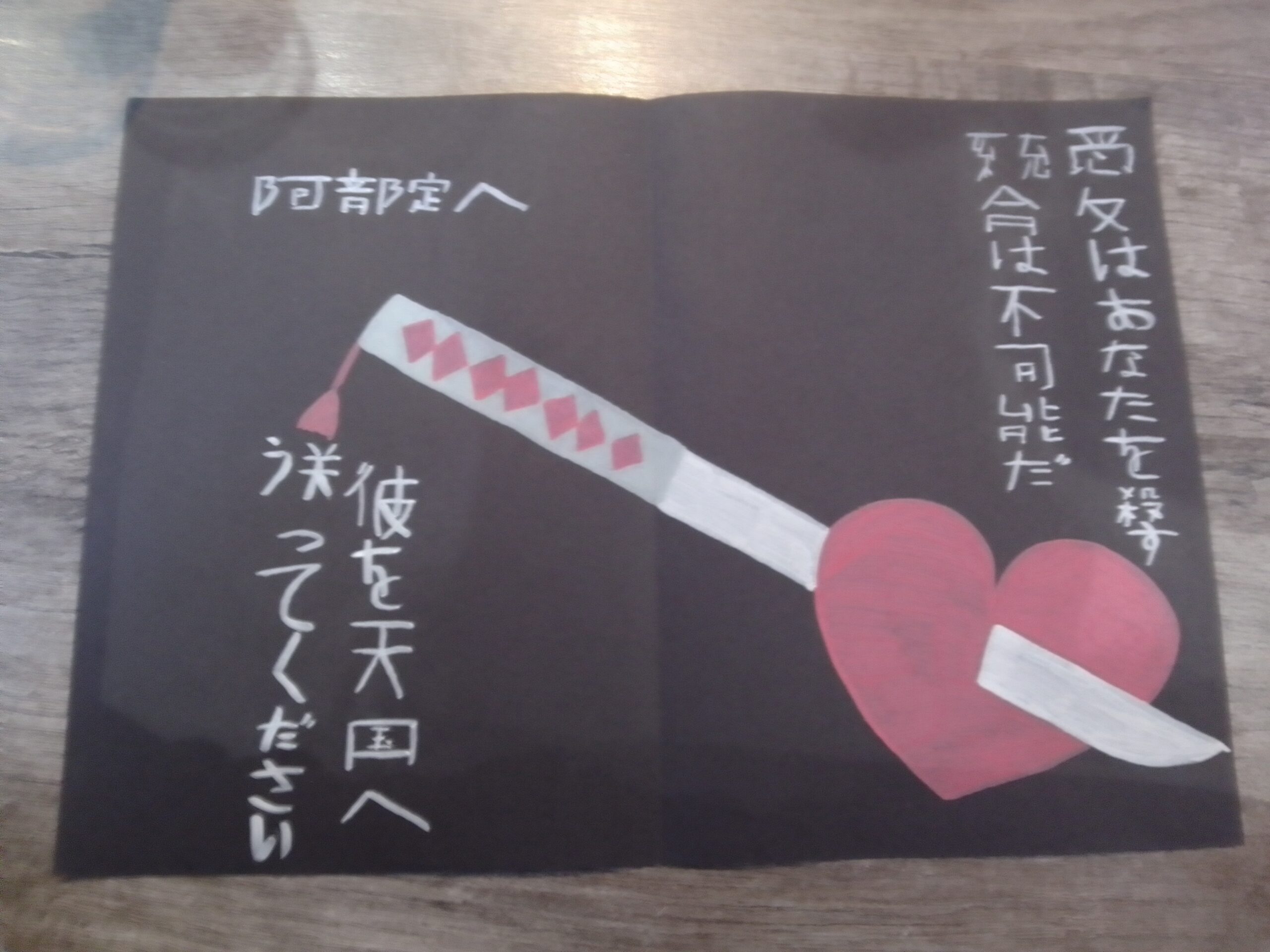 Etegami à l’attention de Abe Sada, geisha ayant tué son amant. Elle peut être considérée comme la première yandere. Cet etegami laisse supposer que l’idée de tuer son amant lui a été suggéré.