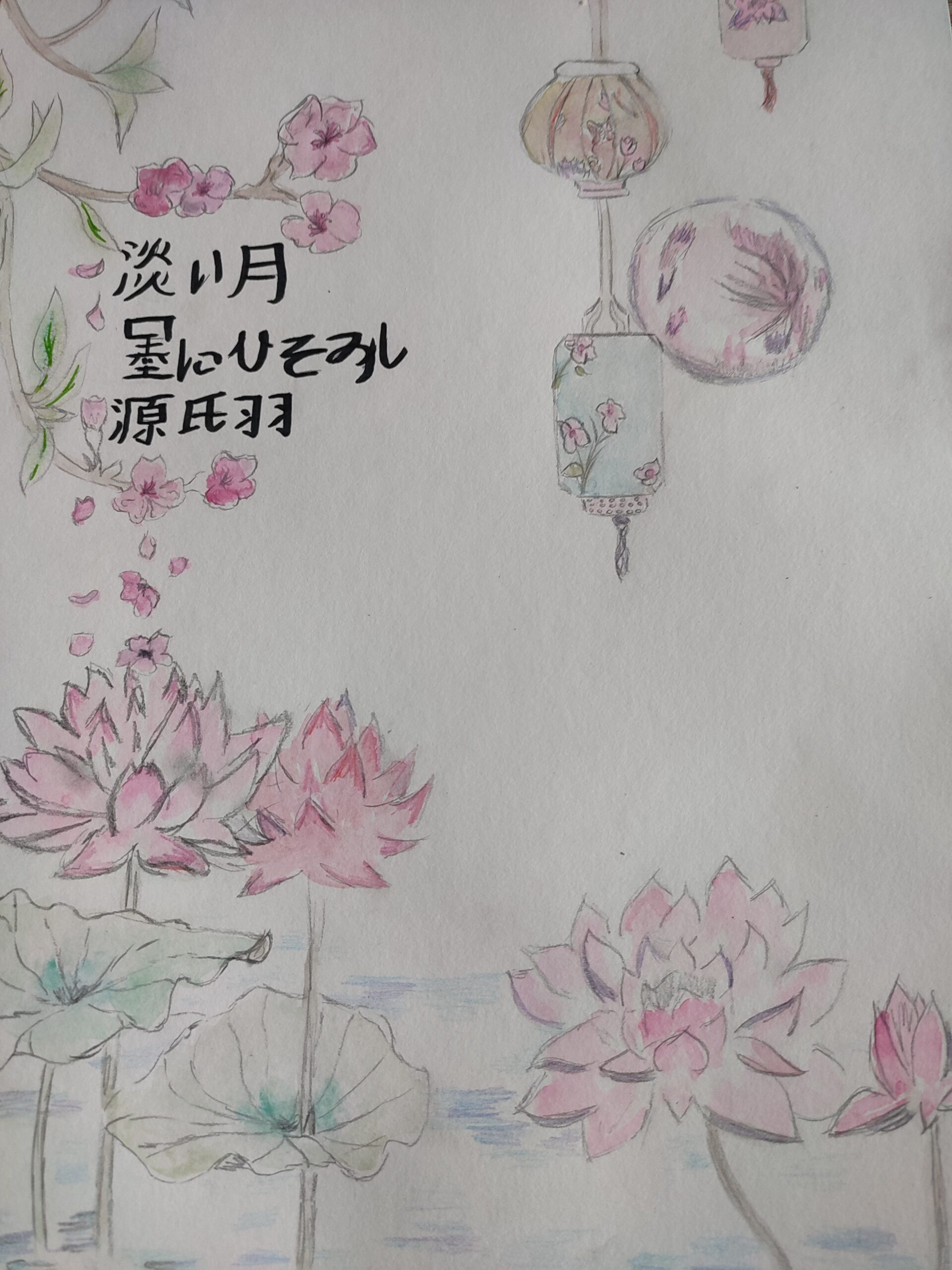 Mon etagami porte sur une écrivaine de l’époque de Heian,Murasaki Shikibu. Celui est donc composé d’un court haïku portant sur la jeune femme et ses écrits, notamment le genji. Il y a également un dessin en fond realisé avec de l’aquarelle, des crayons de couleurs et un lyner. Il y a des fleurs de lotus, pour rappeler la nature très importante dans les haïku et une lune comme décrite dans le poème.