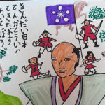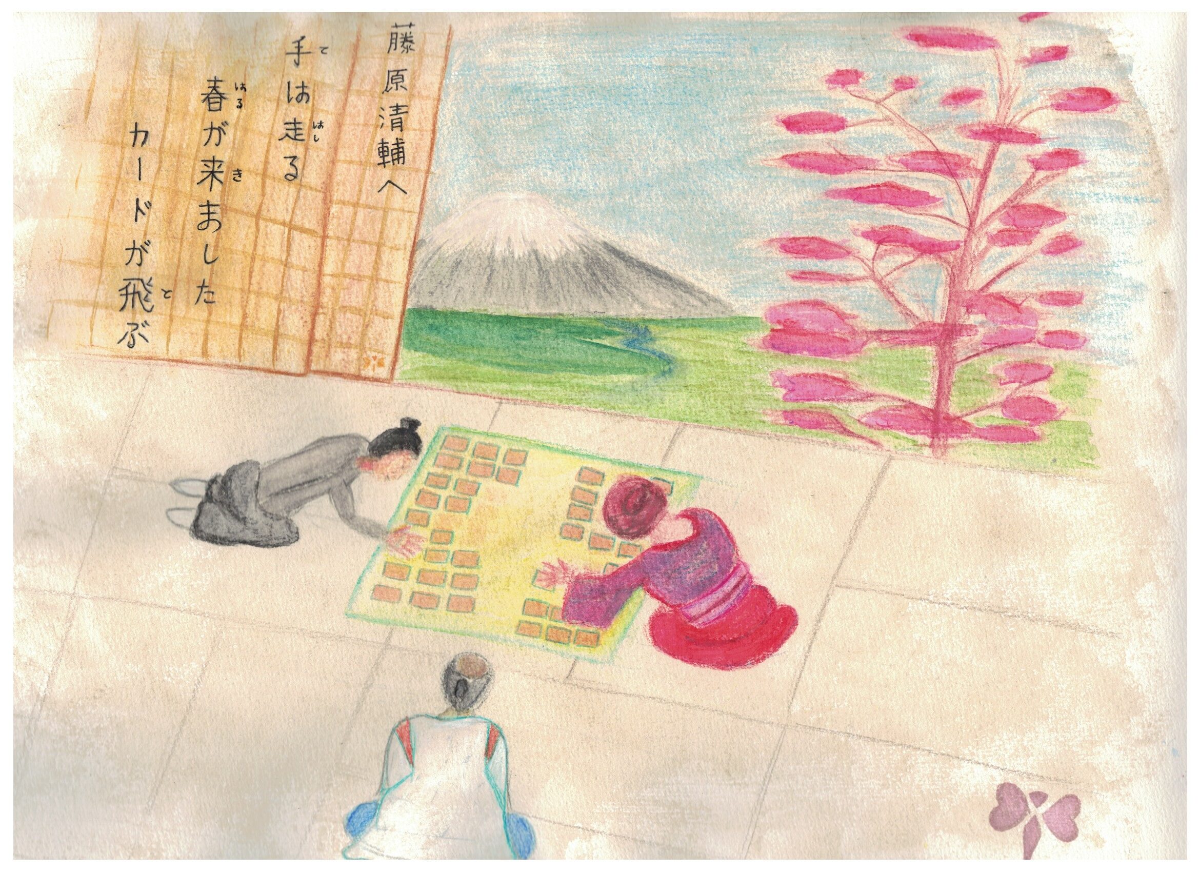 C’est un etegami à Fujiwara no Kyosuke, qui a écrit de nombreux poèmes intégrés dans le jeu du Karuta. J’ai écrit le texte sous forme de haiku pour rester dans le thème de la poésie. J’ai choisi d’intégrer Kyosuke en tant que lecteur dans mon dessin pour qu’il assiste à une partie du jeu auquel il a participé dans l’écriture des poèmes utilisés. Cela va avec l’axe enjeux et formes de la communication car les poèmes sont des messages qui permettent de s’exprimer et aussi car dans Détective Conan (mon animé préféré) ce jeu de carte a été utilisé pour résoudre une affaire.