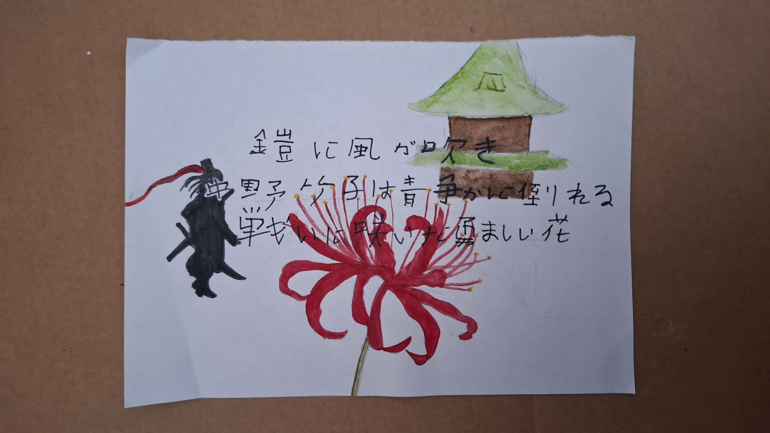 Dans cet etegami, j’écris à Nakano Takeko, une “onna bugeisha” (femme combattante) ayant vécu et comba