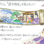 J’ai représenté 紫式部 (Murasakishikibu), l’autrice du Genji Monogatari, assise avec un pinceau pour rappeler son rôle d’éc