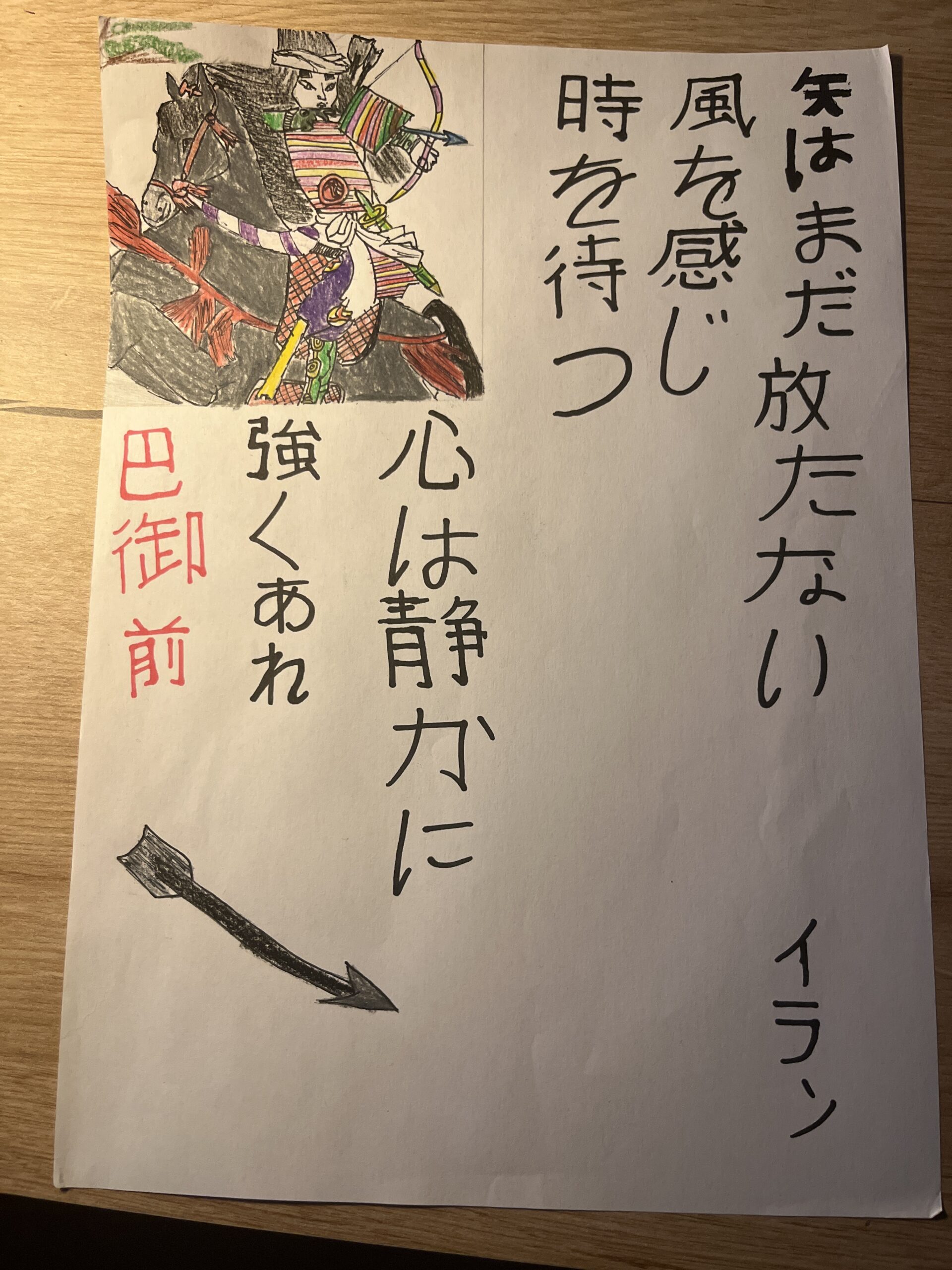 Mon etegami illustre le courage et la persévérance, comme dans les écrits de Miyamoto Musashi. Le dessin représente un s